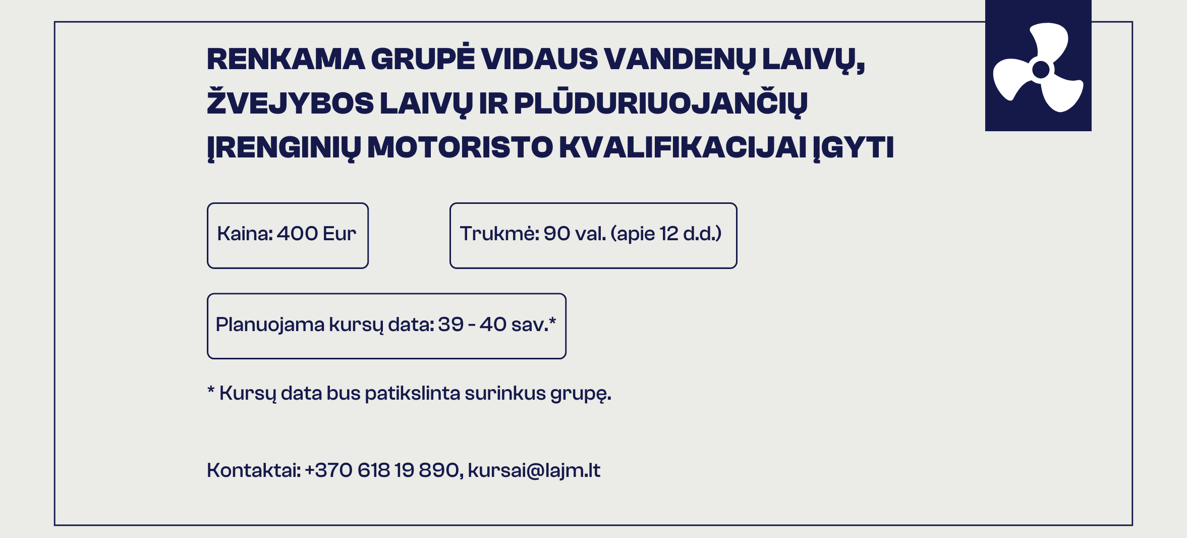 Dar yra vietų į renkamą grupę vidaus vandenų laivų, žvejybos laivų ir plūduriuojančių įrenginių motoristo kvalifikacijai įgyti!